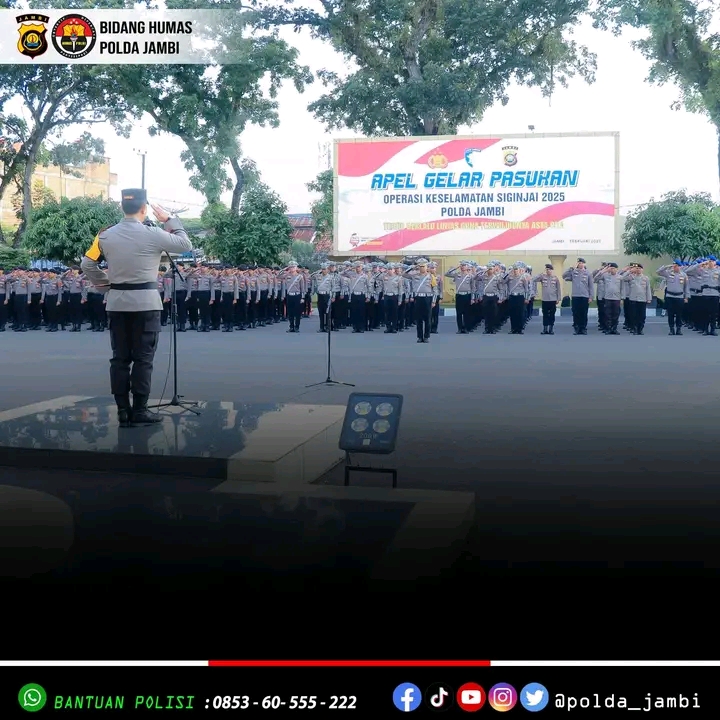 Newssurya.com//JAMBI-Polda Jambi melaksanakan Apel Gelar Pasukan Operasi Keselamatan Siginjai 2025 dengan Tema Tertib berlalu lintas guna terwujudnya Asta Cita bertempat di Lapangan Hitam Mapolda Jambi pada, Senin (10/2/2025).