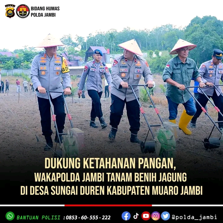 Newssurya.com//MUARO JAMBI-Wakapolda Jambi Brigjen Pol. Edi Mardianto didampingi Kapolres Muaro Jambi AKBP Heri Suprawan melaksanakan penanaman benih jagung di Desa Sungai Duren Kabupaten Muaro Jambi pada Senin, (10/02/2025)