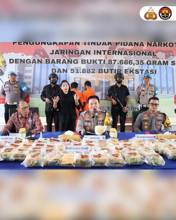 Riau – Kapolda Riau Irjen Pol. Mohammad Iqbal, S.I.K., M.H., memimpin konferensi pers di Mapolda Riau, terkait pengungkapan kasus tindak pidana peredaran narkotika jaringan internasional. Barang bukti narkotika yang disita petugas berupa sabu seberat 87,686 kilogram dan 51.882 butir pil ekstasi di Mapolda Riau, Selasa (18/02).