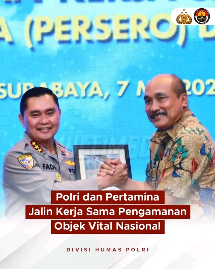 Newssurya.com//JAKARTA-Kabaharkam Polri, Komjen Pol. Dr. H. Mohammad Fadil Imran, M.Si., dan Senior Vice President HSSE Pertamina, Lelin Eprianto menandatangani perjanjian kerja sama Polri dan Pertamina tentang bantuan pengamanan dan penanganan pelanggaran dan/atau tindak pidana di objek vital nasional strategis dan objek vital lainnya. Selasa/25/02/2025.