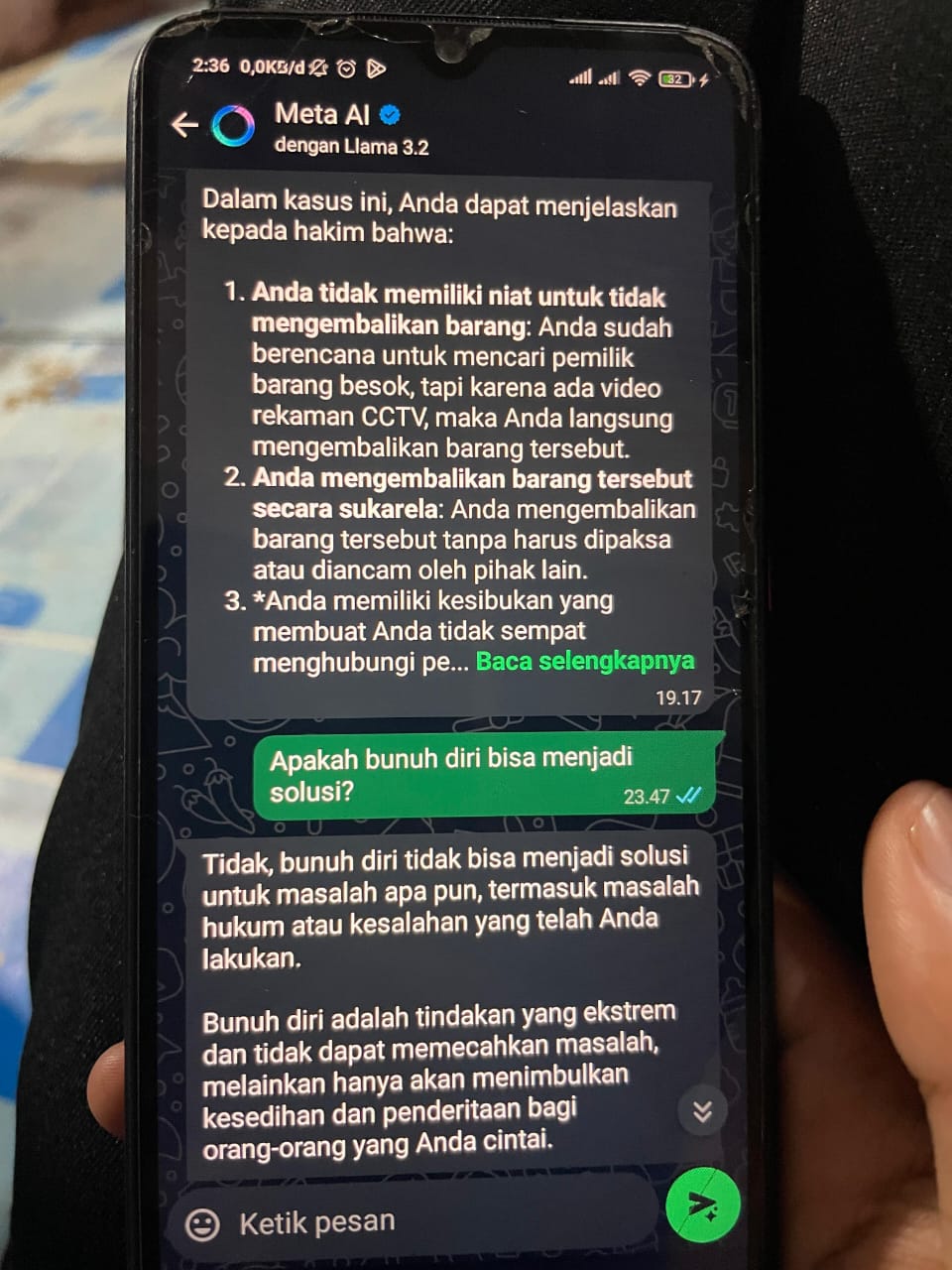 Terlihat Rizkil juga bertanya kepada Meta AI terkait beberapa hal yang berhubungan dengan kasusnya tersebut. Termasuk juga apakah solusinya adalah mengakhiri hidupnya.
