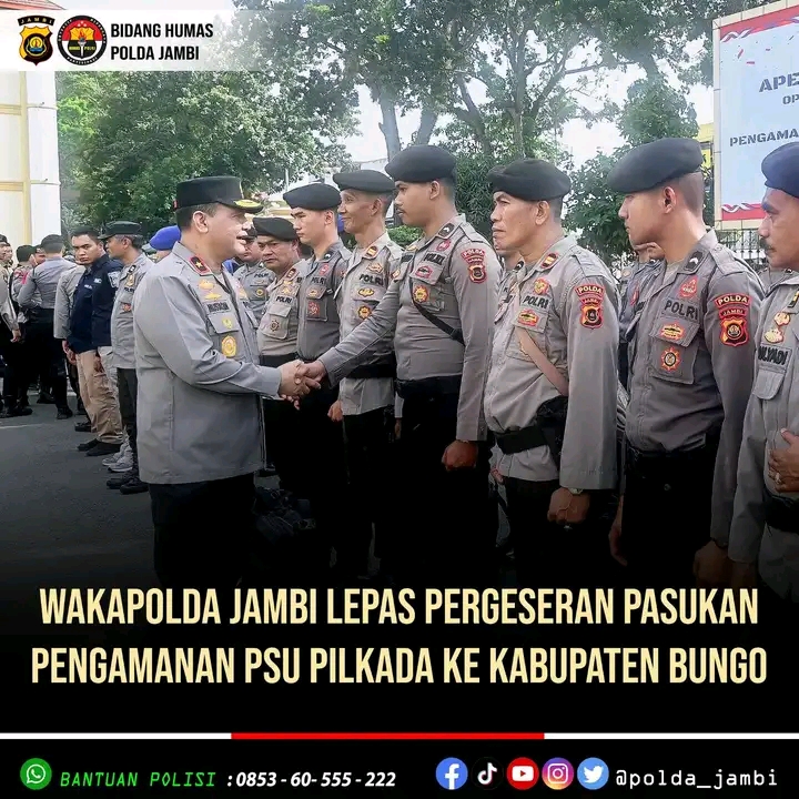 ” Hari ini 327 personel Polda Jambi diberangkatkan untuk melakukan pengamanan PSU di wilayah Kab. Bungo. Akan ada 21 TPS di Kab. Bungo yang melaksanakan Pemungutan Suara Ulang (PSU). Kita harapkan bersama agar pelaksanaan PSU ini dapat berjalan dengan aman dan damai agar situasi Kamtibmas tetap terjaga. ” ucap Kabid Humas Polda Jambi Kombes Pol. Mulia Prianto.(*)