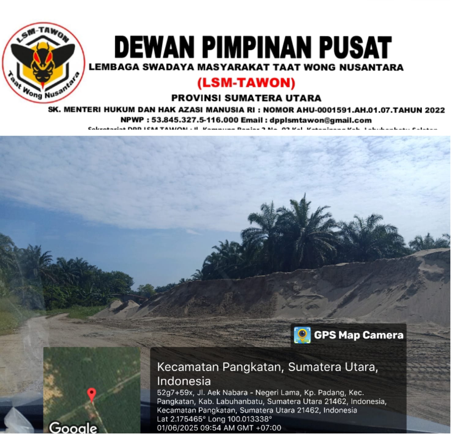 Dewan Pimpinan Pusat Lembaga Swadaya Masyarakat Taat Wong Nusantara (DPP LSM TAWON) secara resmi melaporkan dugaan aktivitas penambangan pasir ilegal (galian C) di wilayah Kabupaten Labuhanbatu, Sumatera Utara, ke Kepolisian Daerah Sumatera Utara (Polda Sumut). Laporan tersebut disampaikan dalam bentuk surat tertulis yang ditujukan kepada Kapolda Sumut Cq Direktur Reserse Kriminal Khusus.