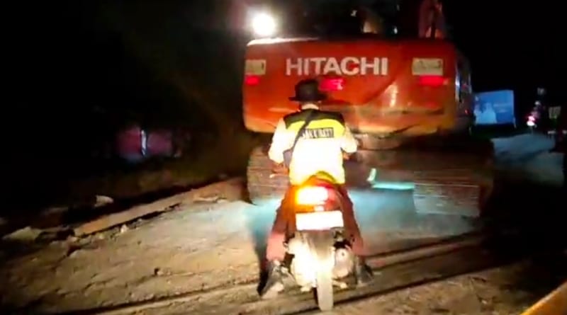 newssurya.com Muara Enim – Sebuah alat berat jenis excavator yang digunakan untuk pembangunan proyek Flyover di Gelumbang, nampak melintas di jalan Raya dan Rel perlintasan Kereta Api di perbatasan kelurahan Gelumbang – Desa Sigam, kecamatan Gelumbang, kabupaten Muara Enim, pada Selasa malam (1/7/2025) sekitar pukul 19.00 WIB.