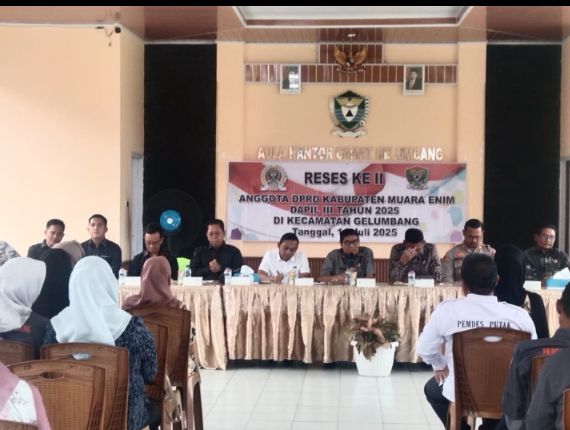 Gelumbang Muara Enim newssurya.com Acara Reses ke ll DPRD Muara Enim dapil lll resmi di buka di aula kantor camat Gelumbang, kabupaten muara Enim, Sumsel. Jumat 11 juli 2025. Acara tersebut, dipimpin langsung wakil ketua DPRD Muara Enim hadiono SH, Selain itu reses bertujuan Mengidentifikasi masalah-masalah yang dihadapi masyarakat, kemudian Menampung kebutuhan masyarakat dan memperjuangkannya. Hadiono SH, wakil ketua DPRD yang memimpin jalannya Reses ke ll, nampak hadir juga Nino andrian SE, Mukarto SH, Suryadi SE, Lusi suryadi, izroni ilias, S,pd MM, pasma ajiansyah ST, Wayan, dan Ponira SH Mkn. Serta unsur tripika kecamatan Gelumbang serta Forum Komunikasi Badan Permusyawaratan Desa (FKBPD ) Kecamatan Gelumbang.