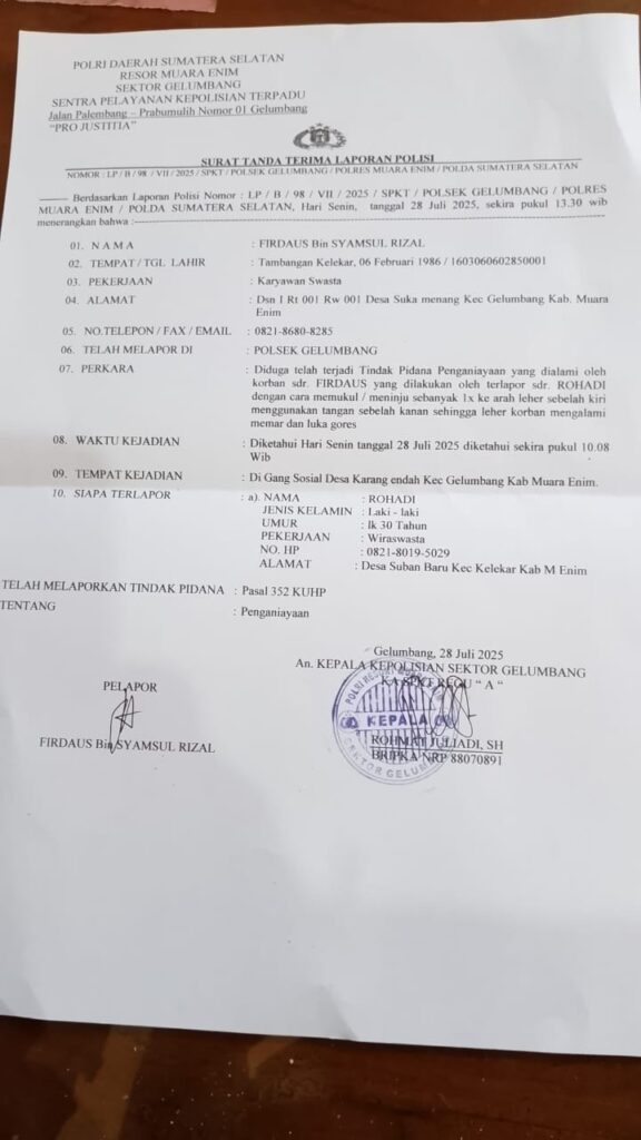 Dalam laporan dengan nomor LP/B/98/VII/2025/SPKT/POLSEK GELUMBANG/POLRES MUARA ENIM/POLDA SUMSEL, korban mengungkapkan peristiwa penganiayaan terhadap dirinya bermula ketika ia mengisi minyak motor di depan Bengkel Mobil Negro tak jauh dari lokasi proyek, Tiba-tiba dipanggil terlapor.