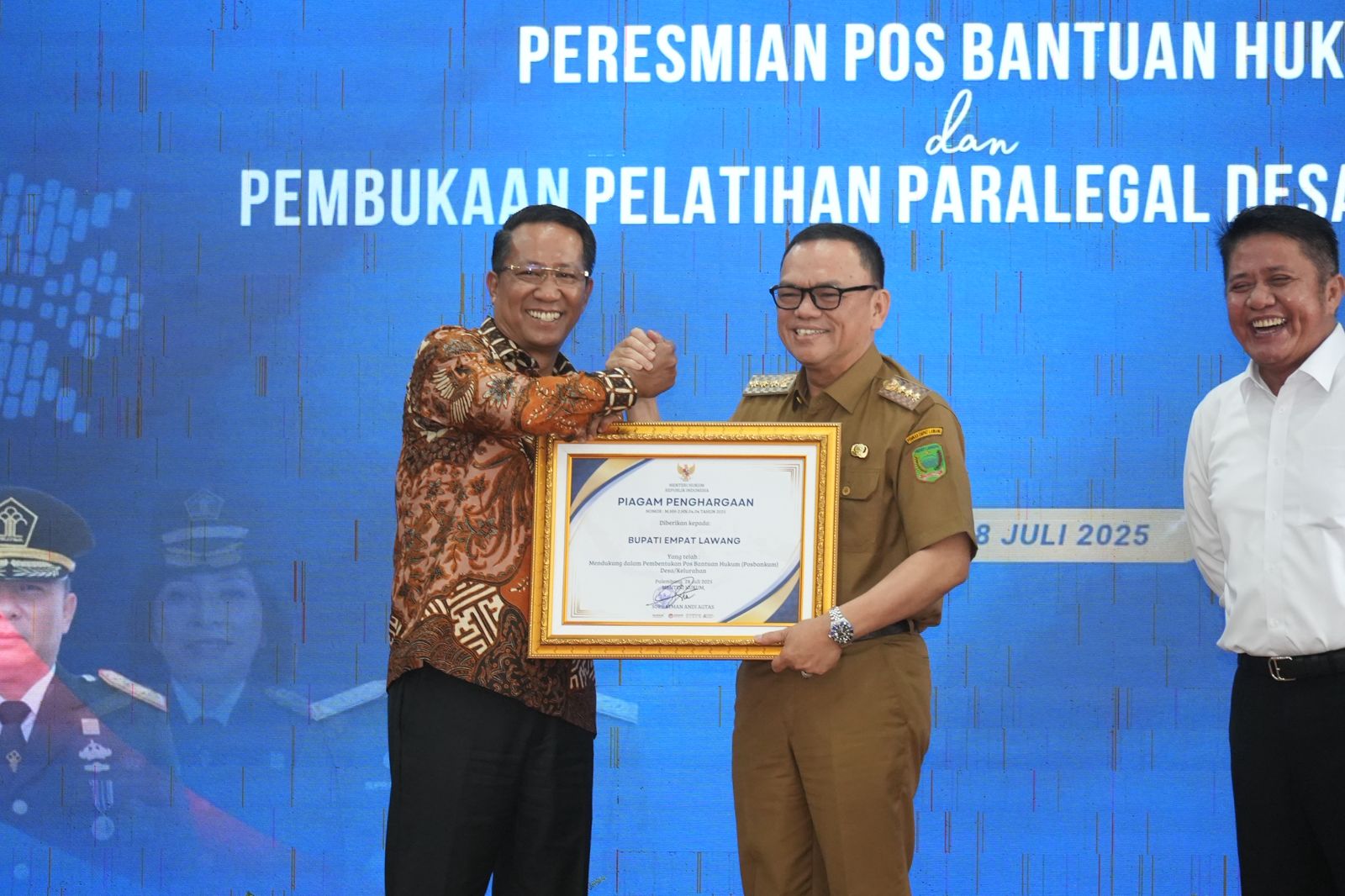 Palembang, Sumatera Selatan Newssurya. Com – Bupati Empat Lawang, Dr. H. Joncik Muhammad, S.Si., SH., MM., MH, menerima penghargaan dari Kementerian Hukum dan Hak Asasi Manusia (Kemenkumham) atas kontribusinya dalam mendukung dan menyukseskan pembentukan pos bantuan hukum (Posbankum) di tingkat kelurahan dan desa.Penghargaan ini diserahkan langsung oleh Menteri Hukum dan HAM, Supratman Andi Agtas, di Griya Agung Palembang pada Senin (28/7/2025). Acara tersebut turut dihadiri oleh Gubernur Sumatera Selatan H. Herman Deru dan 13 bupati serta wali kota se-Sumsel.Posbankum: Wujud Keadilan Bagi Masyarakat Kurang MampuMenkumham Supratman Andi Agtas menjelaskan bahwa Posbankum merupakan terobosan Kemenkumham RI untuk memberikan akses keadilan bagi masyarakat kurang mampu yang menghadapi persoalan hukum. “Keadilan itu merupakan hak seluruh warga negara, kehadiran pos bantuan hukum hari ini menjawab itu,” ujarnya.Kepala Badan Pembinaan Hukum Nasional Kemenkumham RI, Min Usehin, menambahkan bahwa kegiatan Posbankum bertujuan meningkatkan akses keadilan bagi masyarakat yang membutuhkan bantuan hukum, dengan mendekatkan dan mempermudah layanan melalui Posbankum desa dan kelurahan.Dukungan Penuh dari Pemerintah DaerahGubernur Herman Deru menyatakan kesiapannya untuk berada di barisan terdepan dalam mendukung pembentukan Posbankum desa dan kelurahan. Ia juga mengajak seluruh pemangku kepentingan untuk berkolaborasi demi terwujudnya hukum yang berkeadilan bagi masyarakat Sumatera Selatan.Bupati Joncik Muhammad menegaskan bahwa bantuan hukum bukan hanya milik masyarakat kota, tetapi juga hak masyarakat Empat Lawang. “Mari kita nyalakan Posbankum di 156 desa dan kelurahan, insyaallah setiap konflik antar warga bisa dicari jalan keluarnya di Posbankum desa sehingga Empat Lawang tetap kondusif,” tutur Joncik Muhammad.Pada kesempatan yang sama, sebanyak 20 perwakilan kepala desa dan lurah se-Kabupaten Empat Lawang turut serta dalam pelatihan Paralegal Posbankum, sebagai langkah nyata dalam mewujudkan program ini di tingkat desa dan kelurahan.