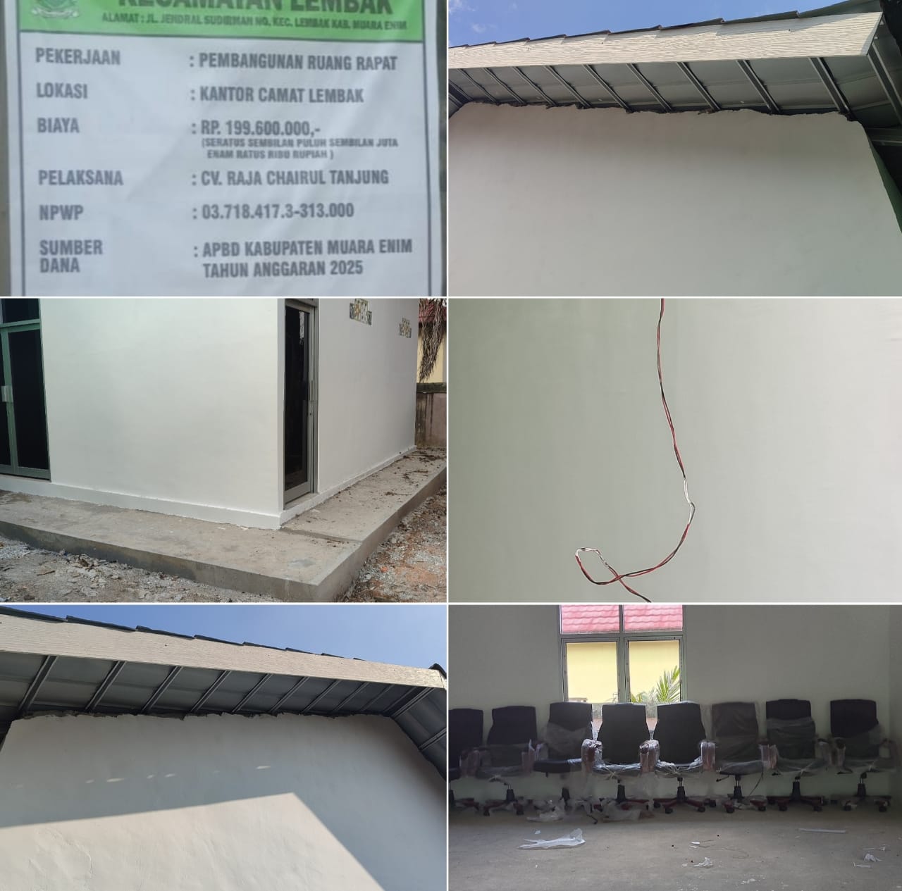 Pembagunan Ruang Rapat Kantor Kecamatan Lembak diduga tidak sesuai dengan spesifikasi yang telah ditetapkan.