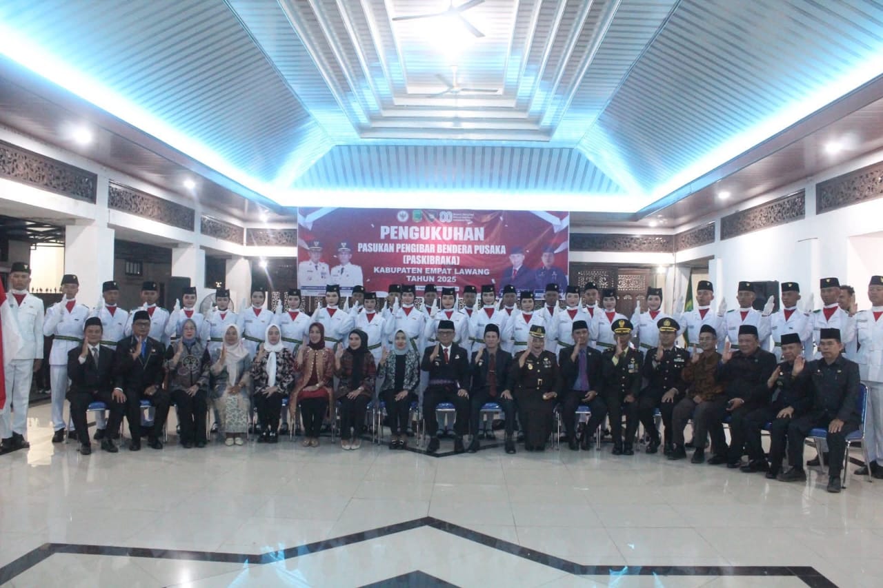 EMPAT LAWANG Sumatra Selatan Newssurya. Com – Bupati Empat Lawang, Dr. H. Joncik Muhammad, S.Si., S.H., M.H., M.M., secara resmi mengukuhkan Pasukan Pengibar Bendera Pusaka (Paskibraka) Tingkat Kabupaten Empat Lawang dalam Upacara Pengukuhan yang berlangsung di Pendopoan Rumah Dinas Bupati, Jumat (15/8/2025).