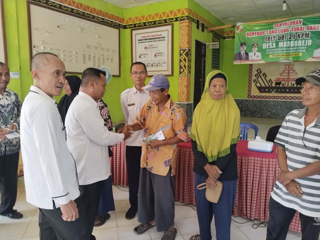 Lampung utara-Pemerintah Desa Margorejo, Kecamatan Kotabumi Utara, Lampung Utara, baru-baru ini melaksanakan pembagian Bantuan Langsung Tunai (BLT) Dana Desa tahap 3 untuk bulan Juli, Agustus, dan September 2025. Acara ini dihadiri oleh Sekcam Kotabumi Utara, Ludi Hendarto, Kepala Desa Margorejo, Andi Turut, serta seluruh aparatur desa, termasuk Badan Permusyawaratan Desa (BPD), Pendamping Desa (PD), dan Pendamping Lokal Desa (PLD).