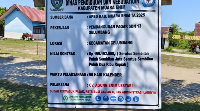 Muara Enim – Pembangunan Pagar Sekolah Dasar Negeri (SDN) 13 Gelumbang yang terletak di desa Midar, kecamatan Gelumbang, kabupaten Muara Enim, mendapat seruan untuk diperiksa oleh instansi terkait, lantaran spesifikasi bangunan yang dikerjakan oleh CV. Agung Enim Lestari dengan pagu anggaran Rp.199.192.000,- tersebut mendulang tanda tanya.