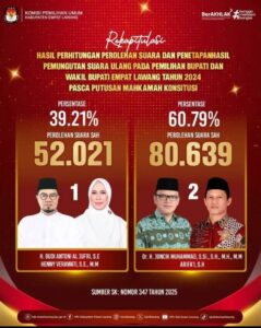 Quick Count LKPI: Joncik Muhammad-Arifa’i Unggul Jauh di Pilkada Empat Lawang, Petahana Berpeluang Pertahankan Kursi